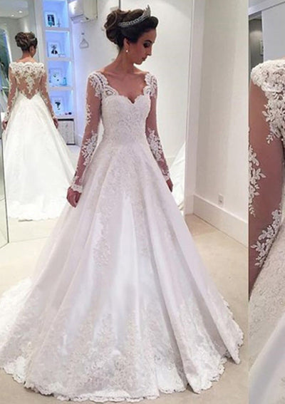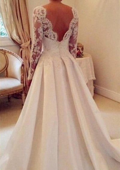Атласное свадебное платье А-силуэта Batuea с длинными рукавами и V-образным вырезом сзади