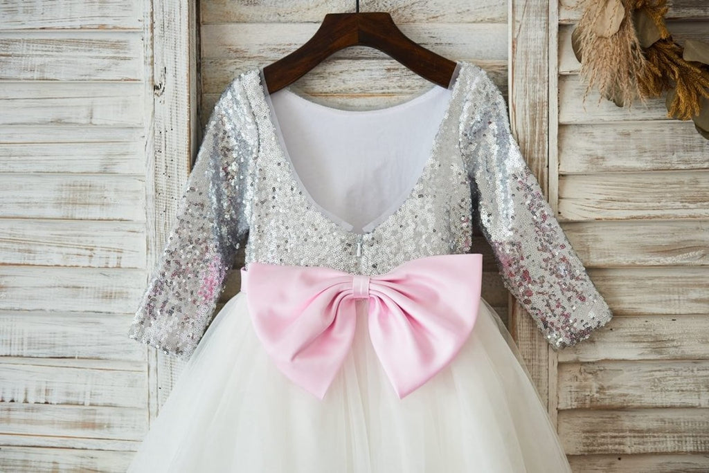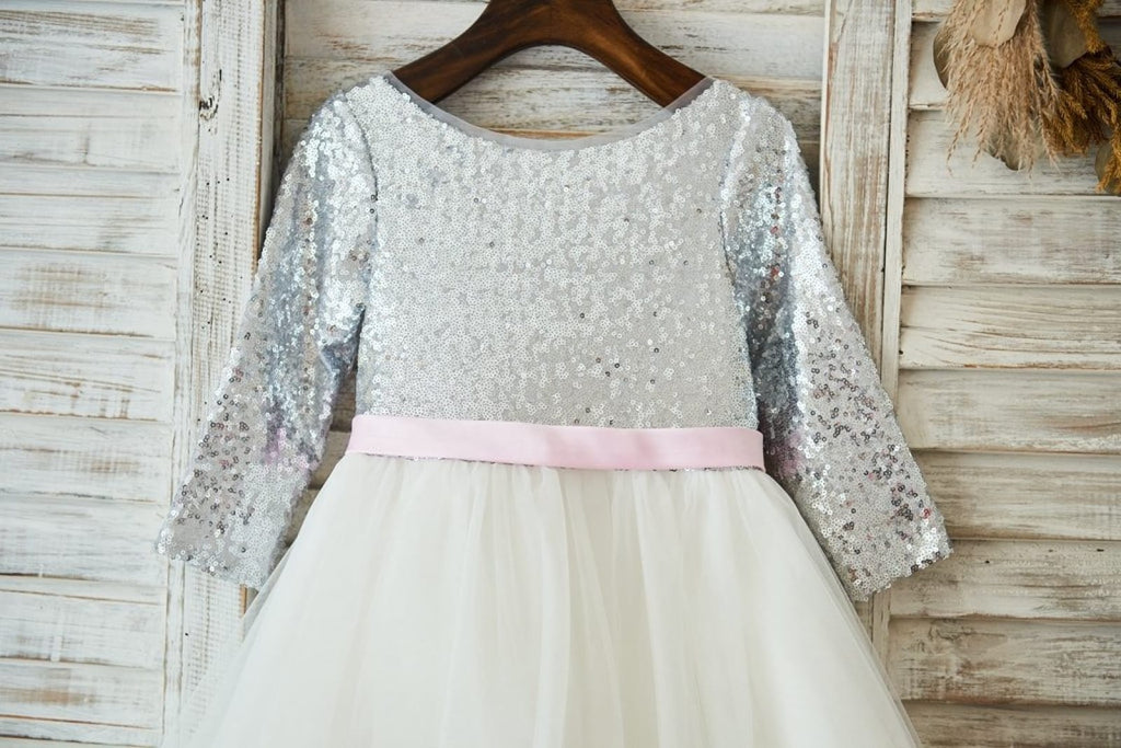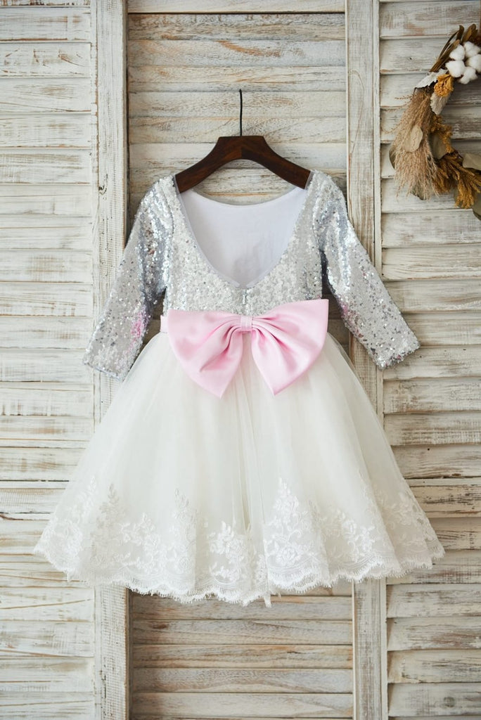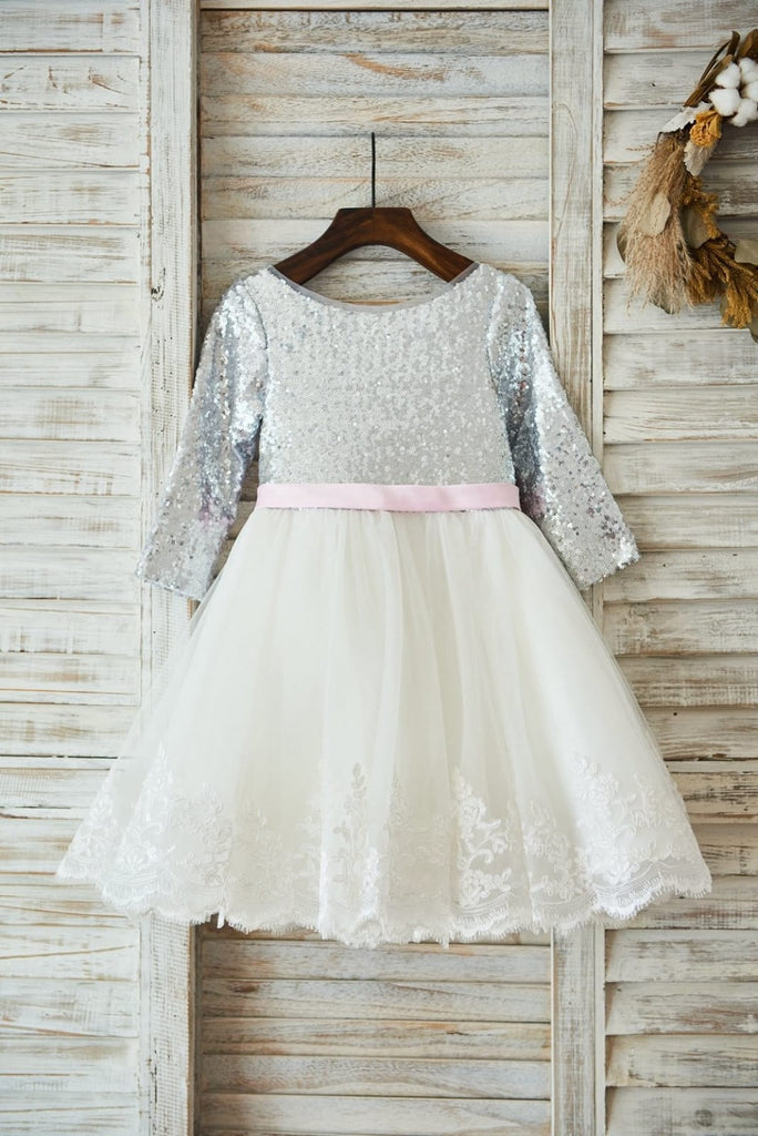 Длинные рукава Серебряные блестки цвета слоновой кости Кружева Тюль Свадебное платье с цветочным узором для девочек